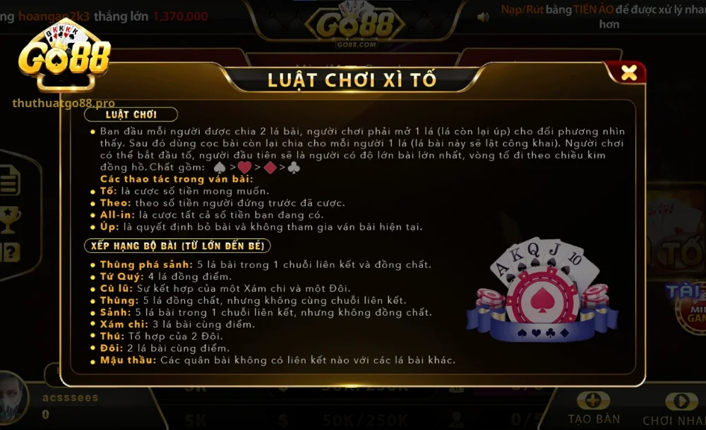 Luật chơi Xì tố trên Go88 đơn giản nhưng không kém phần thú vị, với các quy định về phân bài và các thao tác tố, theo, up và all-in, hứa hẹn mang đến những ván đấu đầy kịch tính và may mắn.